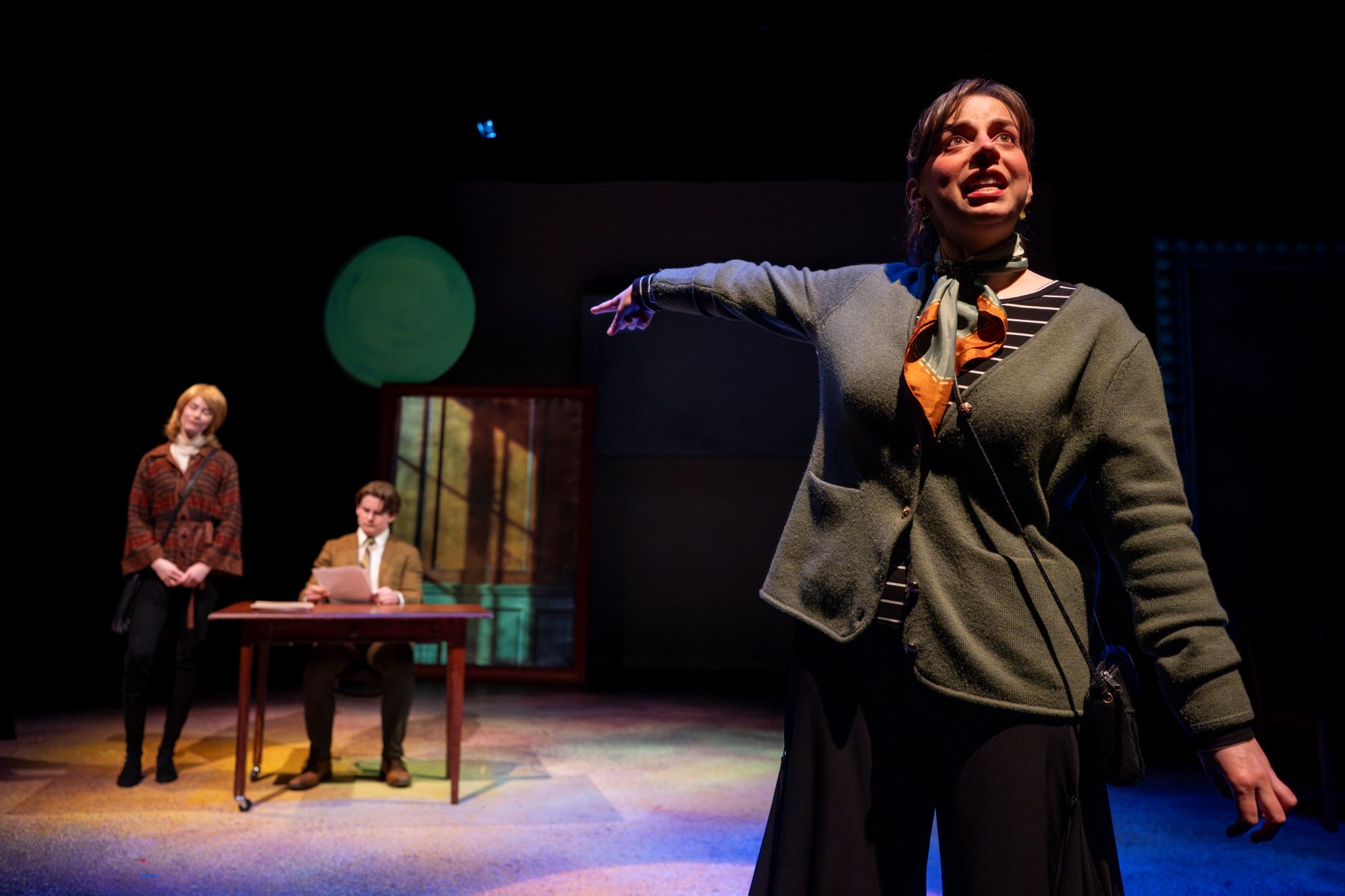 The narrative generally becomes more coherent. Shifts in location are handled smoothly, bringing on some simple pieces of furniture and creating backdrops with projections on various set pieces (Chantel Fortin, set design). In one scene, several characters attend an orchestra concert. They’re portrayed sitting in chairs in front of the main theatre curtain, looking towards the audience, and I was reminded of the opera-box scenes in Evelyn Strange.