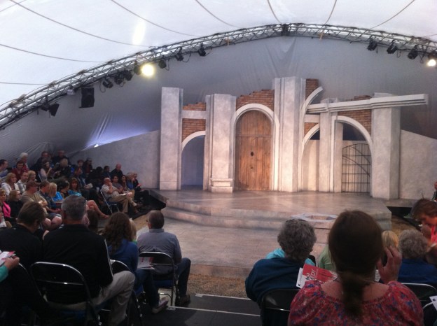And at Shakespeare on the Saskatchewan, the summer theatre in a tent in Saskatoon, I saw Taming of the Shrew. I found it more upsetting than I had bargained for, and I wanted to think about it more before writing a review, and I still haven’t really figured out what to think. I’d read the play many years ago, but never seen it or studied it. And somehow, I’d had the idea that the title was ironic, and that the happy ending of the story had the smart independent woman finding love without compromising herself. But the production I saw, directed by Johnna Wright, left me shocked and uncomfortable. I loved Jenna-Lee Hyde in the role of Katherine, with her sarcastic tone, expressive eyebrows, and short-statured truculence. I wanted her to win Petruchio over or trick him into believing she was tamed, and it was hard for me to read in that intention to the way the play was performed. Petruchio (Joshua Beaudry) used the manipulative techniques of a Pick-Up Artist and an abuser, such as “negging”, gaslighting, and denying her food and sleep, and according to the canonical text, they worked. That is realistic but at the same time awful. The play seemed to be set in the early 1960s, with similar music and costuming choices to those in the Red Deer College production of Comedy of Errors directed by Jeff Page last fall. In a way that’s a good choice for a story of shifts in power imbalance by genders, but the nearly-contemporary setting made me more uncomfortable with the outcome of the story. It also provided for some fun musical interludes, with the characters of Lucentio, Gremio, Hortensio, and Grumio (Nathan Howe, Jacob Yaworski, Skye Brandon, and Matt Burgess) playing as a musical combo, and the performers of Katherine’s sister, mother, and housekeeper (Anna Seibel, Lisa Bayliss, Tara Schoonbaert) also singing harmony in 60s-girl-group style. I didn’t get to see the Freewill Shakespeare production of Shrew this summer, with James Macdonald and Mary Hulbert, but I wish I’d been able to see it as well, to help me put my finger on what bothered me and to see whether different directoral choices would have made a difference.