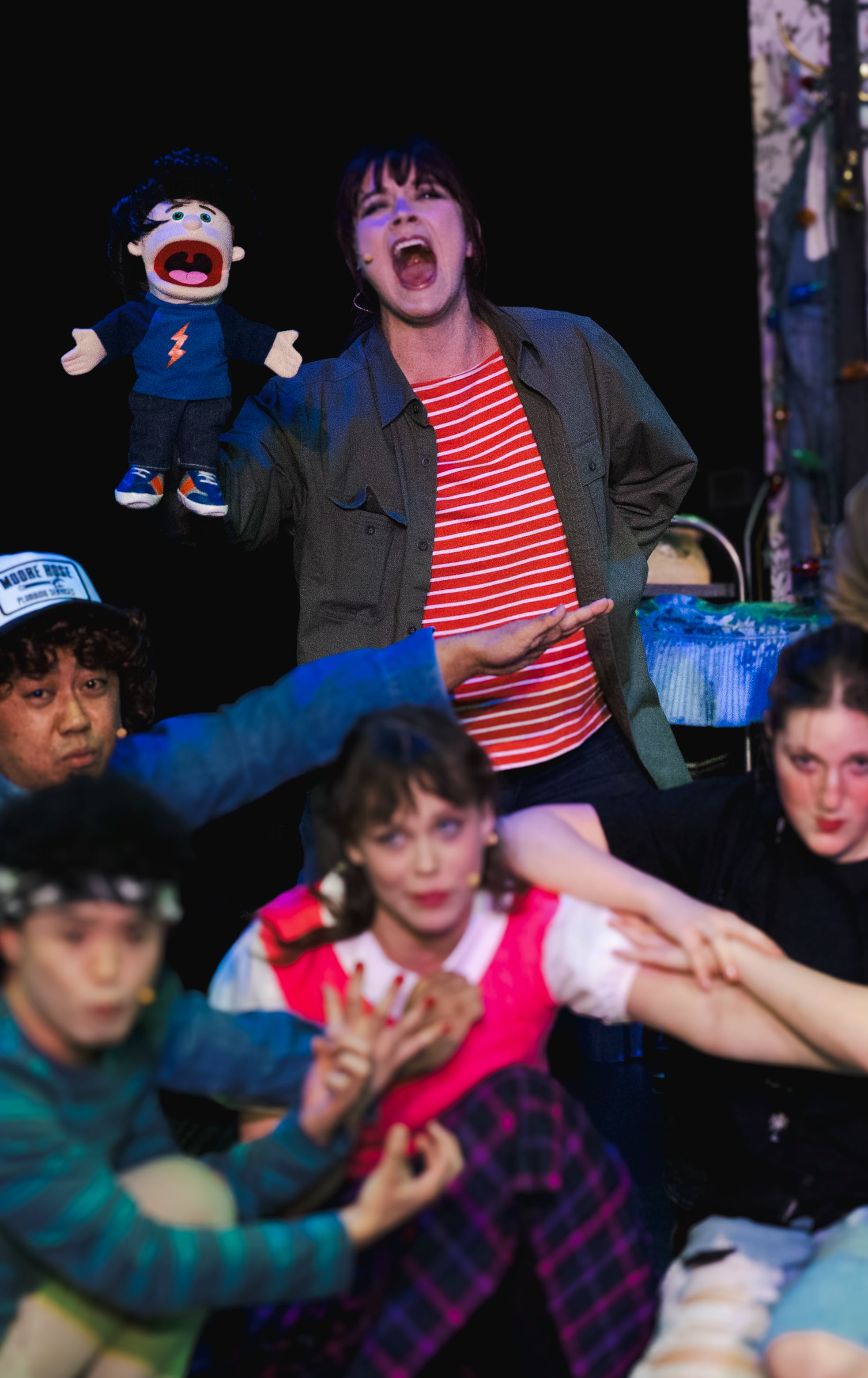 Musical direction was provided by Sally Hunt, with eight other musicians. David Son created choreography for the ensemble that was both exciting and well-executed, and also joined the ensemble himself in a few small roles, including (hilariously) an escaping Goldfish. Debo Gunning designed costumes that supported each character, from Amélie’s artless awkwardness in shirtwaist and Doc Martens, to the more sophisticated Parisian women of the cafe and sex shop, and Elton John fabulously excessive with feathery epaulettes to his sequined jacket. The facilities and technical capabilities of the Timms Centre Main Stage were effectively used by ELOPE’s technical team (set design credit to Leland Stelck). Finlay and Son’s blocking and movement of the large cast on the deep stage never felt crowded.