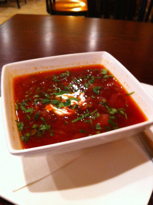 The borscht was superb.  The interesting texture had a fairly thin soup with a dollop of cream to stir in, shreds of beet, larger slivers of potato, and some shredded fresh green bits.  It smelled and tasted great.