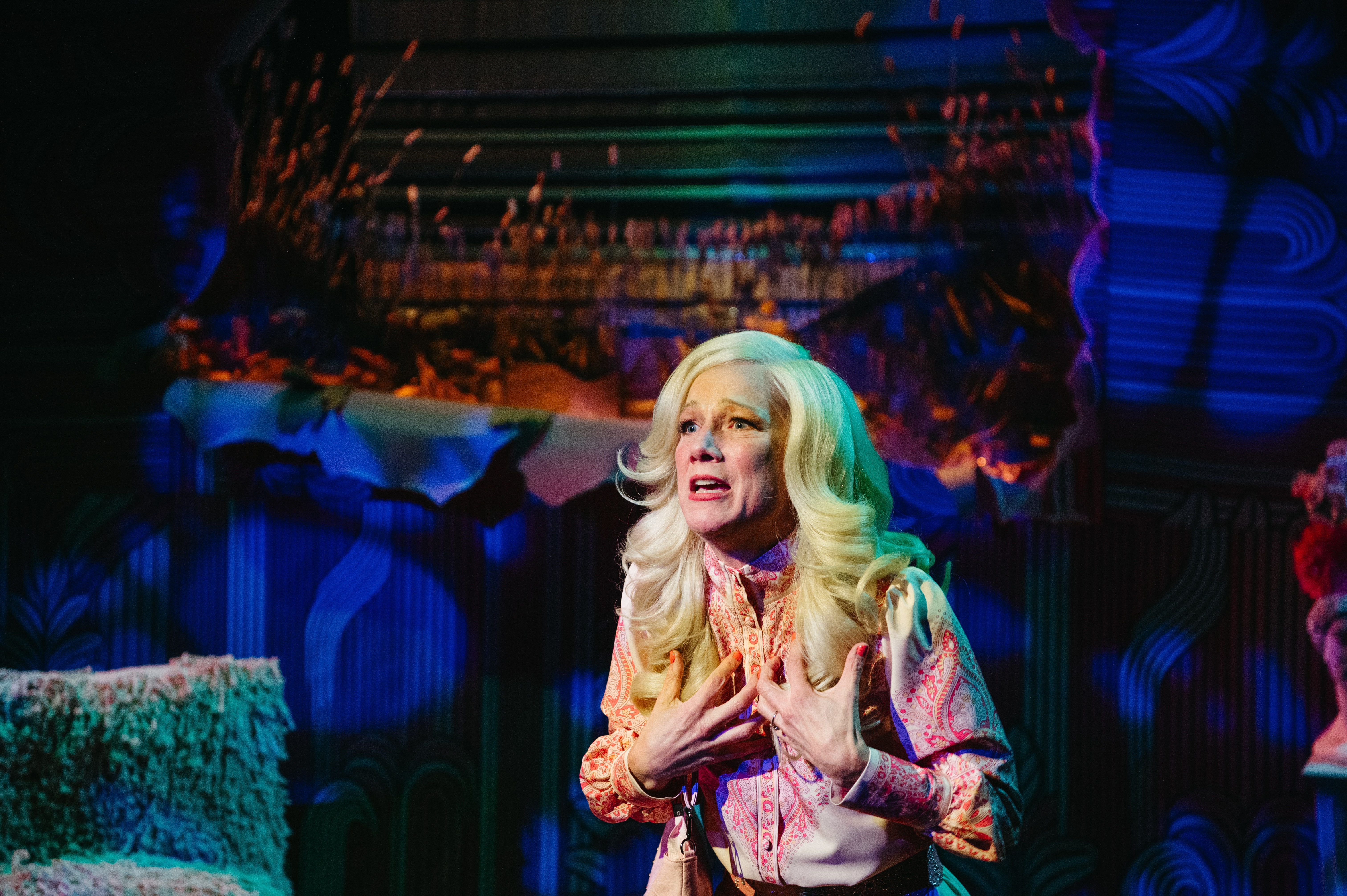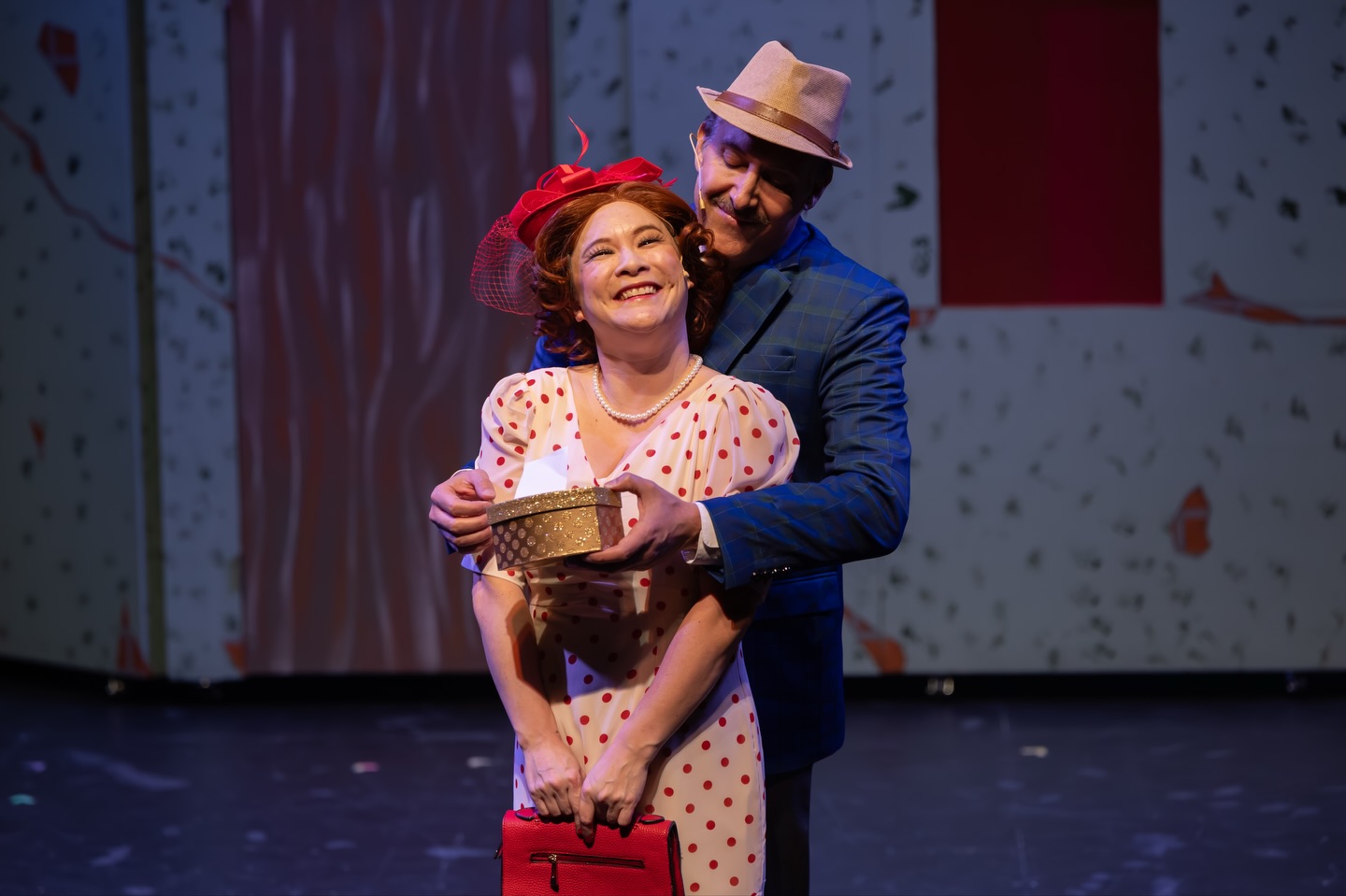 Joanne talks about how she came to love music and dance and especially musical theatre and movie musicals, with memories of being taken on a special movie outing with her parents, wearing a dark red velvet dress with white lace just like her mother’s. “She was beautiful. And on that day, I was a little bit beautiful.” Throughout the play, Joanne bombards Patty with musical theatre history facts and cultural tidbits. She corrects Patty, a sports parent, saying that for dance “it’s not practice, it’s rehearsal”. Their rehearsal outfits are consistent with their different backgrounds/expectations (costumes by Logan Stefura). Joanne is wearing a ballet-pink leotard and tights under a wrap skirt and cut-off CATS t-shirt, while Patty’s outfit includes cutoff grey sweatpants and a football jersey.