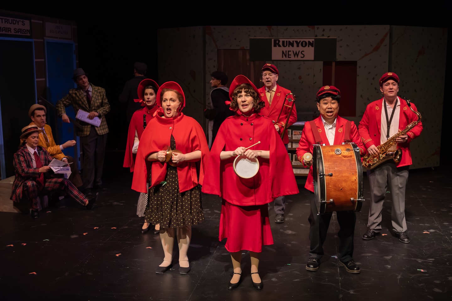 In the first scene they rehearse the tap routine that Miss Amber had been teaching them, to “All the Single Ladies”. (Apparently the women in the class would have been dressed as reindeer, with the man as Santa.) The moves are familiar to anyone who’s watched beginner tap classes. They aren’t very good. They keep running that routine periodically as the story progresses, and they get more in sync. Then they change to a piece better suited to entering “musical theatre duet” instead of the “adult group tap” competition class – Mariah Carey’s “All I Want for Christmas is You”. Their performance gradually improves, and their homemade costumes are both credible and fairytale-delightful. Jason Hardwick’s choreography works well to make the easy moves look hard and then have the dancers gradually master them. The soundscape (Lindsay Walker) evokes tap-dance performances and pop-music fun, right from the pre-show selections.